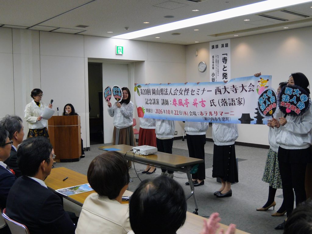 大会の最後には、次回主管として西大寺法人会女性部会が登壇し、令和8年10月22日(木)に瀬戸内市・ホテルリマーニで開催される「第20回 岡山県法人会女性セミナー 西大寺大会」をPRしました。