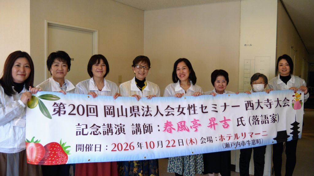 西大寺法人会女性部会では、来年の大会に向けて、地域の魅力を伝えながら温かいおもてなしで皆さまをお迎えできるよう、準備を進めてまいります。