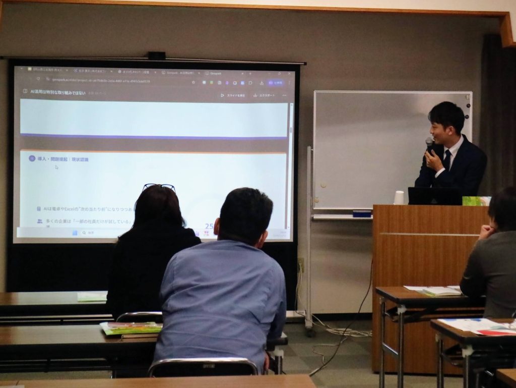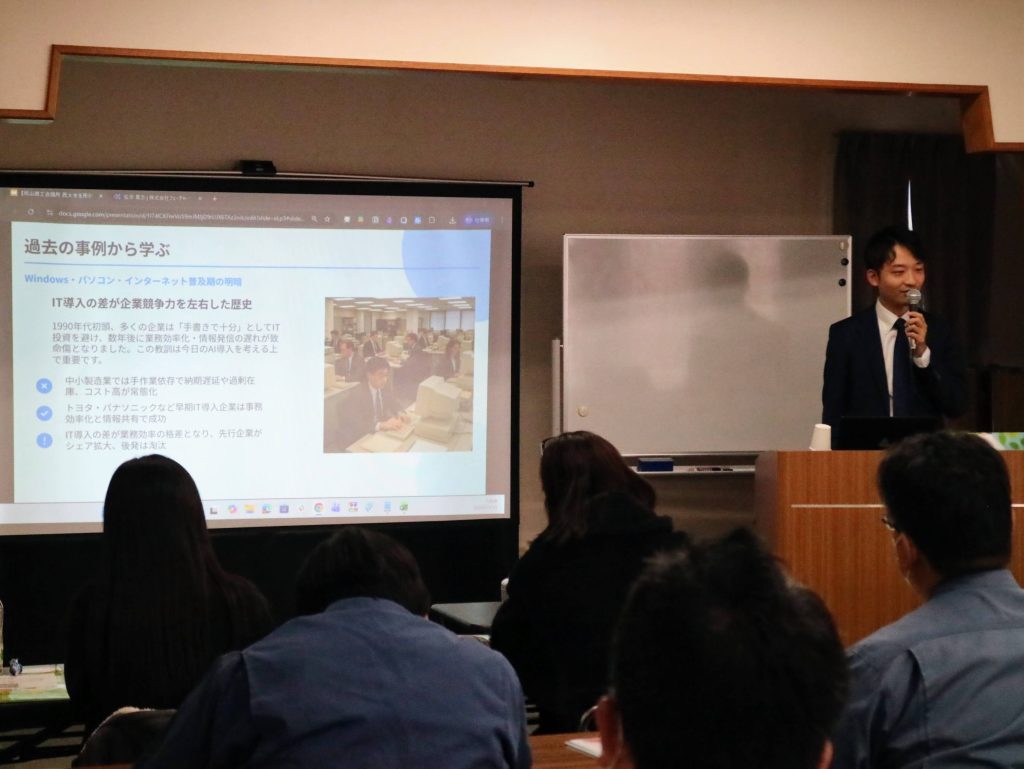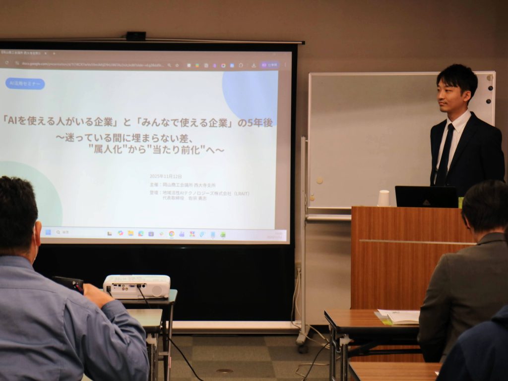 11月12日(水)、岡山商工会議所西大寺支所にて、公益セミナー「会社で使える AI活用セミナー」を開催しました。講師には、地域活性AIテクノロジーズ株式会社 代表取締役の 佐宗 勇志 氏 をお迎えし、AIが特別な人だけのツールではなく、企業全体で活用できる“日常的な業務改善の力”であることを、具体例とともにわかりやすく解説いただきました。