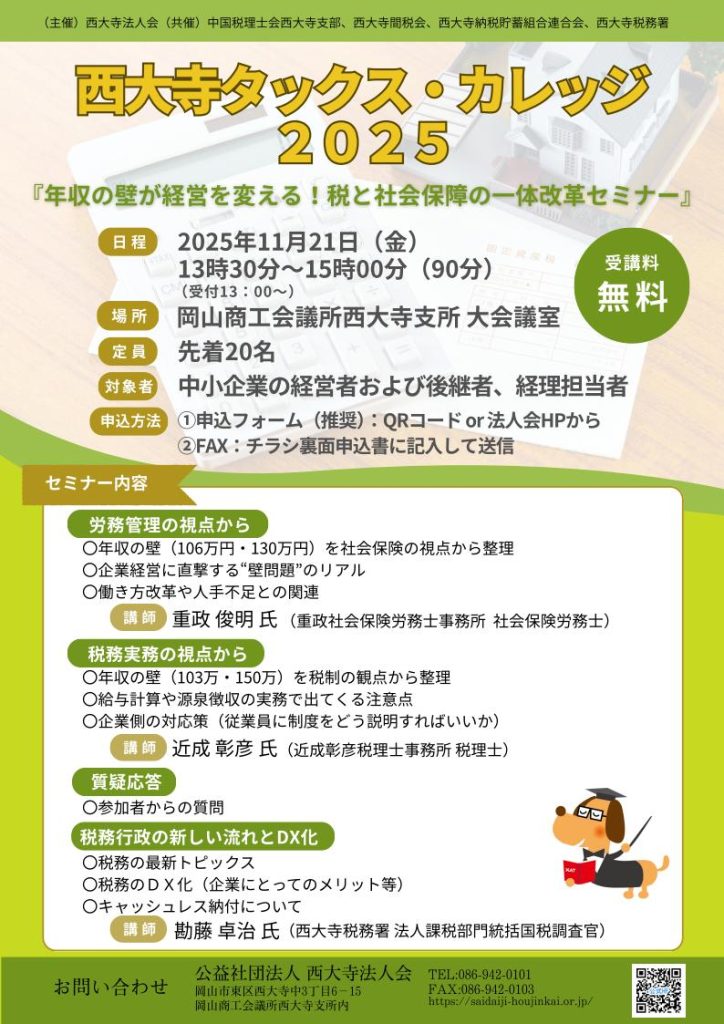 【11/21(金)開催】西大寺タックス・カレッジ2025 「年収の壁が経営を変える!税と社会保障の一体改革セミナー」