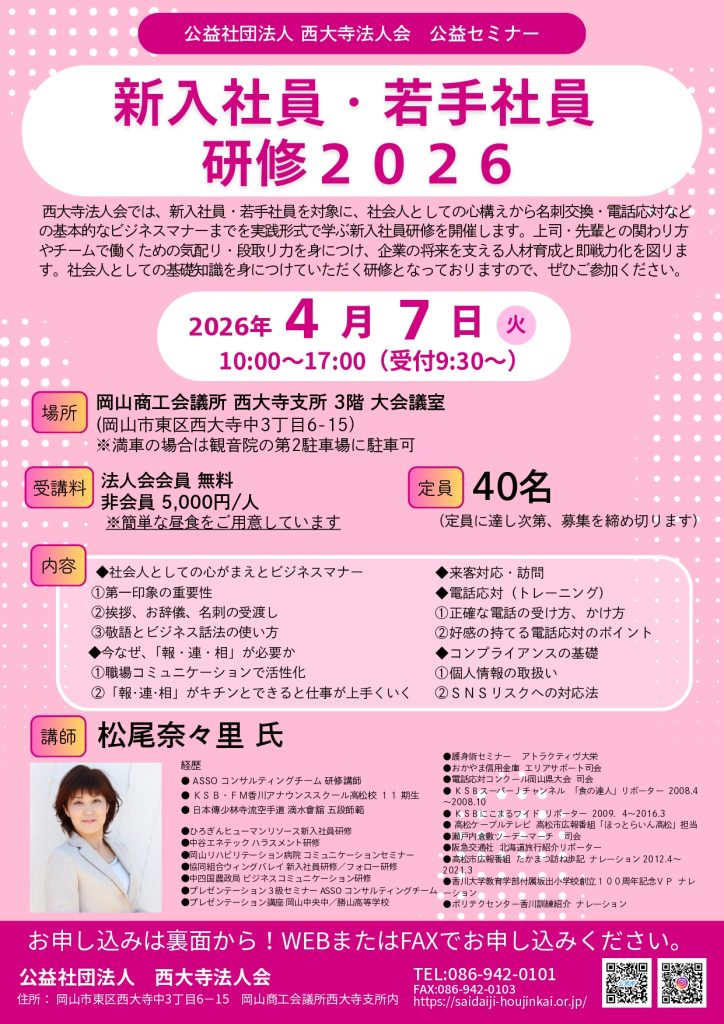 西大寺法人会では、新入社員・若手社員を対象に、社会人としての心構えから名刺交換・電話応対などの基本的なビジネスマナーまでを実践形式で学ぶ新入社員研修を開催します。上司・先輩との関わり方やチームで働くための気配り・段取り力を身につけ、企業の将来を支える人材育成と即戦力化を図ります。社会人としての基礎知識を身につけていただく研修となっておりますので、ぜひご参加ください。